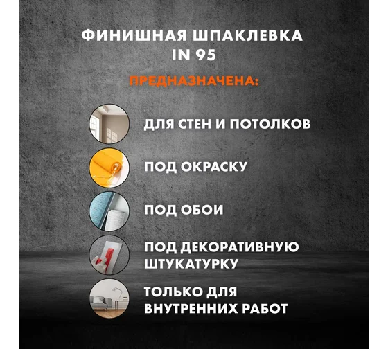Шпаклевка полимерная готовая IN 95 25 кг универсальная Церезит 52713 2247441 полностью готова к применению. Чисто белый цвет шпаклевки способствует снижению расхода лакокрасочных материалов в процессе дальнейшего окрашивания обработанной поверхности. Является универсальной - может применяться на различных поверхностях с низкой прочностью и высокой впитывающей способностью - на гипсокартоне, бетоне, цементной штукатурке. Не рекомендована к применению на деревянных основаниях. Содержит в своем составе мелкодисперсный наполнитель, что способствует получению максимально гладкой поверхности.